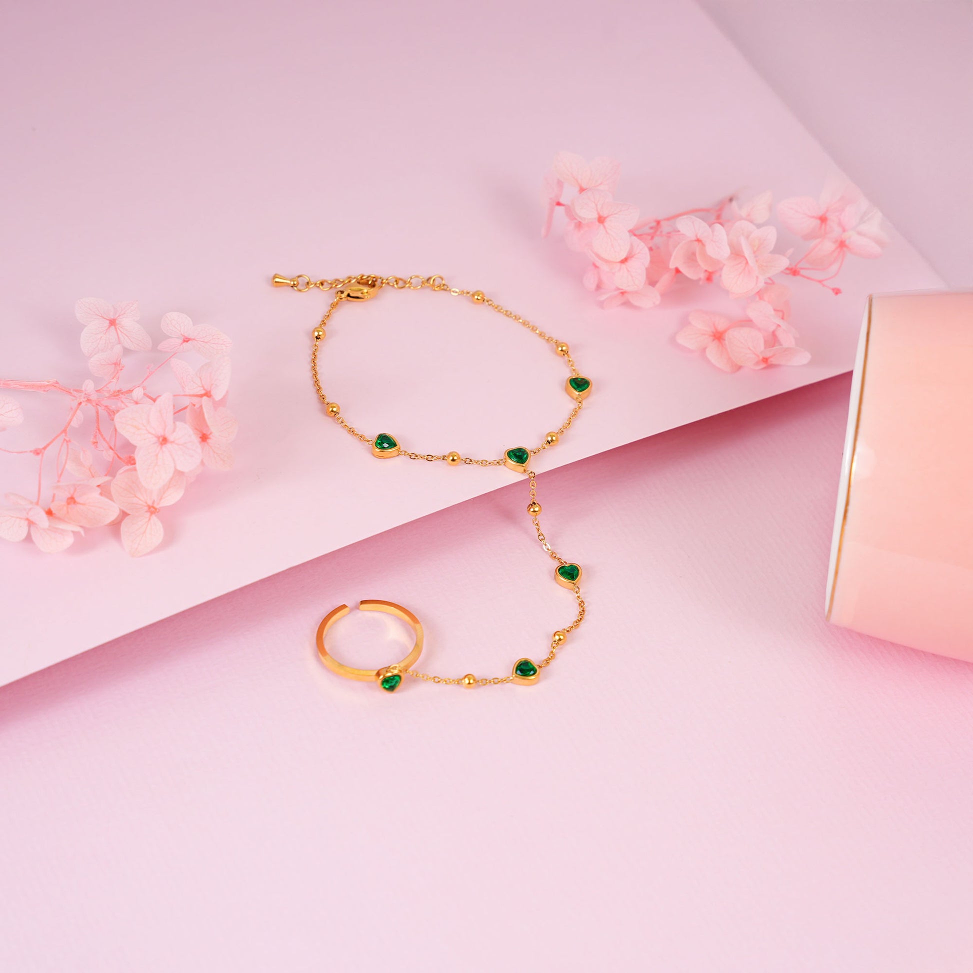 18K Gold Plated Green Heart Hand Chain Bracelet Ring